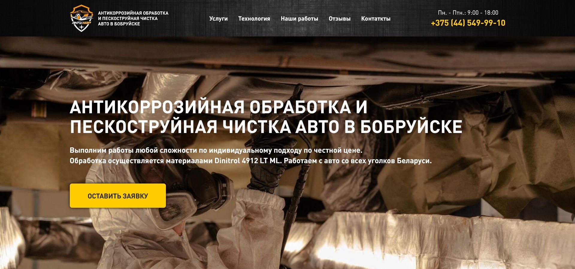 Сайт разработан для организации по антикоррозийной обработке и пескоструйной чистке авто в Бобруйске. На сайте представлен полный список оказываемых услуг, описана технология производства работ, представлена галерея выполненных работ, отзывы клиентов, FAQ, контактные данные с интерактивной картой и формы обратной связи.