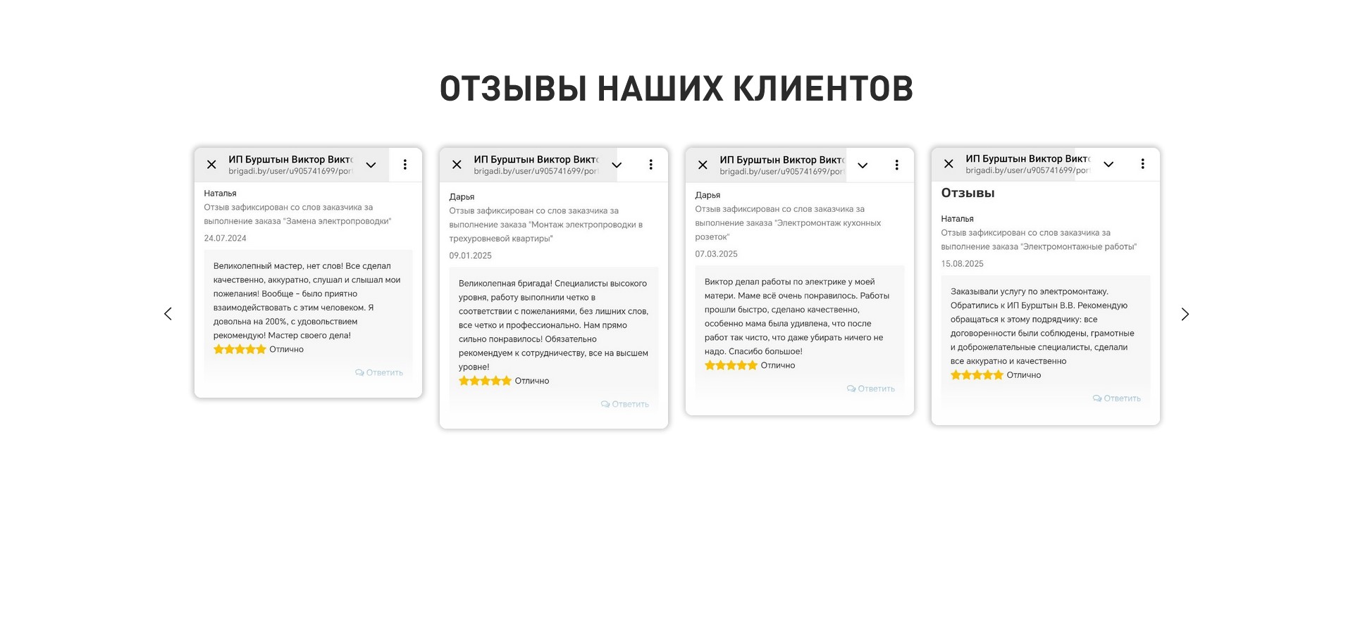 Сайт для ИП, осуществляющего любые электромонтажные работы в Минске и Минской области. На сайте есть формы отправки заявок, которые приходят в телеграм-канал и электронную почту владельца сайта.